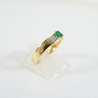 Bague "ruban" : 2 ors 750 mil. ornée d'une émeraude taille coussin dans un pavage de diamants taille brillant (TDD : 58) (largeur : 3,7 mm environ) (très légères égrisures). 3,6 g. brut
