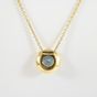 Collier : en or 750 mil. composé d'une fine chaîne à maille forçat retenant un motif circulaire centré d'une topaze bleue ronde (longueur : 40 cm environ) (diamètre motif : 12,3 mm environ). 5,4 g. brut
