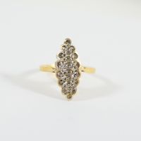 Petite bague marquise : 2 ors 750 mil. sertie de diamants taille 8/8, travail français (TDD : 49) (déformation, petits éclats, rhodiage à prévoir). 2,2 g. brut