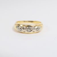 Bague deux ors 585 mil. ajourée et ponctuée de trois petits diamants 8/8. (Eclats) (TDD : 63). 4 g. brut.