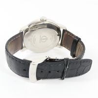 BAUME ET MERCIER, montre d'homme en acier. Boîtier rond, lunette lisse, cadran blanc à chiffres romains, chemin de fer pour les minutes, guichet dateur à 3 H. (Diam : 42 mm environ). Mouvement mécanique à remontage automatique. Signé et numéroté. Sur bracelet en cuir noir à boucle ardillon en acier siglé et signé et boucle déployante.