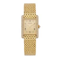CARTIER, Tank Louis : Montre de forme rectangulaire. Référence 78087. Boîtier en or jaune 750 millièmes signé et numéroté 18141. Brancards et couronne sertie de diamants. Cadran doré à chiffres romains et index diamants. Dimensions : 21 × 28 mm environ. Mouvement mécanique à remontage manuel signé. Calibre 78-1. Bracelet en or jaune 750 millièmes maille grains de riz, boucle déployante signée. Sans écrin ni papiers. Poids brut : 59,82 g.