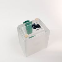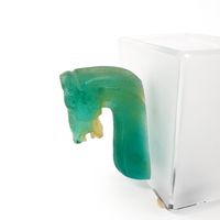 DAUM France Porte-crayons rectangulaire modèle "Bucéphale" en cristal satiné et pâte de verre de couleur verte. Signé sur le côté. Dimensions : 11 x 9 x 12 cm. (Très légères égrisures).