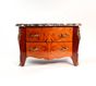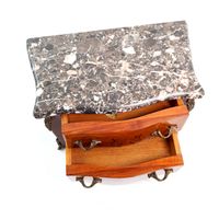 Petite commode de Maîtrise en bois de placage à décor marqueté de fleurs, ouvrant à deux tiroirs. Dessus marbre gris veiné blanc. Style Louis XV. Dimensions : H : 19,5 cm ; L : 32 cm ; P : 17,5 cm. (Eclat).