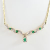 Collier : 2 ors 750 mil. à maille anglaise retenant un motif rubané serti d'émeraudes et de diamants taille 8/8 (longueur : 42 cm). 11,2 g. brut.