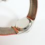 ROLEX "Datejust", réf. 6519, vers 1965 : Montre-bracelet de dame en acier, boîtier rond, lunette striée, cadran noir, index bâton appliqués avec points luminescents, guichet dateur à 3H, mouvement automatique, bracelet en cuir orange usé, boucle déployante papillon en acier non d'origine, signée et numérotée (diamètre : 26 mm environ) (plexiglas légèrement rayé, légères rayures d'usage, usures aux aiguilles).
