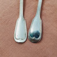CHRISTOFLE et ALFENIDE, CHINON, seconde moitié du XIXème siècle : Suite de 5 grandes cuillers et 1 louche en métal argenté, modèle à filet et cuilleron pointu. Signés Christofle et ALFENIDE, poinçon CC pour Charles Christofle, datées entre 1868 et 1873. Légères rayures d'usage. On y joint une grande cuiller en métal argenté d'un modèle proche, (orfèvre DL au caducée, datée 1872).