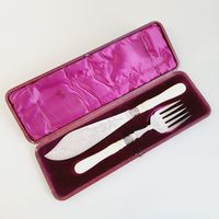 JAMES DIXON & SONS, Sheffield, fin XIXe, début XXe siècle : Couvert de service à poisson en métal argenté comprenant une fourchette et une pelle de service à décor gravé de fleurs et de poisson, manche en résine crème. Longueurs : 32,5 et 26 cm. Avec un écrin.