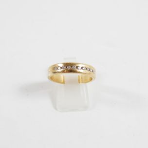 300 / 400 €Anneau en or 750 mil à 2 godrons centré d'une ligne de diamants (Larg : 5 mm ; TDD : 58,5). 6,7 g brut.