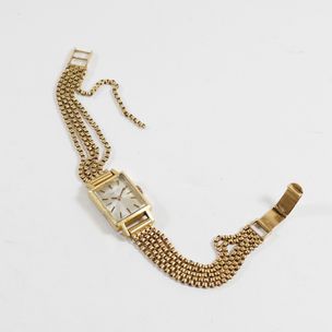 500 / 650 €Bracelet-montre de dame en acier doré, boîtier rectangulaire (Dim : 1,8 x 1,5 cm ; Rayures, manque dorure), cadran argenté guilloché à index bâton, tour de bras composé de 5 chaînes en or 750 mil maillons jaseron godronnés (1 accidentée) (Long : 16,5 cm environ), CERTINA, mouvement mécanique. 20,1 g brut.
