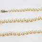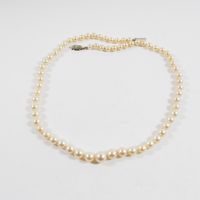 Collier de perles de culture en chute (Diam : de 5,1 à 8,4 mm environ), fermoir en or gris 750 milrehaussé de 3 diamants 8/8 (Long : 48 cm). 25,9 g brut.