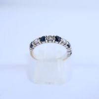 Demi-alliance américaine : en or gris 750 mil. alternée de diamants brillant et de saphirs ronds, travail français (TDD : 53,5) (égrisures, rhodiage à prévoir, serti à revoir). 3,4 g .brut