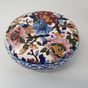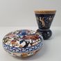 GIEN : - Bonbonnière couverte en faïence fine polychrome à décor « Pivoines » sur fond blanc. Marque au tampon. Diamètre : 18,5 cm ; - Vase à panse ronde et col évasé en faïence fine polychrome à décor « Renaissance » sur fond bleu. Marque au tampon. Hauteur : 17 cm.