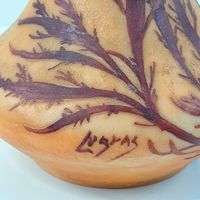 LEGRAS Vase à base renflée et long col droit. Épreuve en verre opalin façon pierre dure orangé à décor d'algues et de plantes aquatiques gravé en réserve à l'acide et émaillé polychrome. Signé. Hauteur : 33 cm. (Eclats sur une feuille et sous la base)