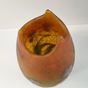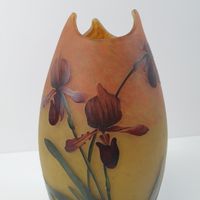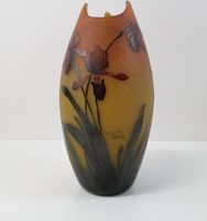 MULLER Frères, Lunéville Vase de forme ovoïde à col trilobé étiré à chaud à décor d'iris. Epreuve en verre marmoréen multicouche vert et brun sur fond jaune et orangé. Signé "Muller Frères Lunéville", dans le décor. Hauteur : 29,5 cm. (Infime éclat et léger défaut dans l'émail)