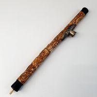 Pipe à opium décorative en os, à décor sculpté de dignitaires et idéogrammes parmi des nuages stylisés, plaque en métal. Travail probablement indochinois. Longueur : 48 cm. (Manque le fourneau)