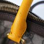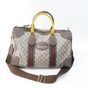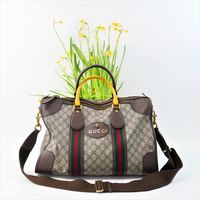 GUCCI. Sac polochon "Néo Vintage Suprême GG" en toile enduite monogrammée et cuir marron orné de 2 bandes Web rouge et verte, patch central logo doré en cuir marron surmonté d'une tête de tigre. Deux poignées en cuir jaune. Bandoulière réglable amovible en tissu marron. Garniture en métal doré. Intérieur doublure tissu écru et cuir marron. 2 petites poches plaquées et 1 poche zippée. Ht.30xLarg.44xProf.16cm environ. Numéroté. Bon état général, usures aux coins et pieds en dessous, taches intérieur.