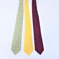 HERMES Paris. Lot de 3 cravates: en twill de soie imprimé à motifs de coquelicots sur fond jaune (ref.7749 OA), branches feuillagées sur fond vert d'eau (ref.7833 UA), et feuilles sur fond bordeaux. Bon état, petites taches.