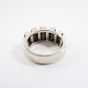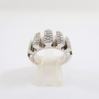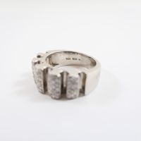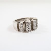 Bague : en or gris 750 mil. à décor cranté, ornée de 5 pavages de diamants taille brillant (2 tailles 16/16 et 8/8) (TDD : 55,5) (largeur : 9,5 mm environ) (tout petits éclats). 12,6 g. brut