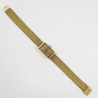 Bracelet-montre de dame : en or 750 mil., boîtier rectangulaire, mouvement mécanique, bracelet composé de 7 chaînes et boucle à cliquet en or 750 mil. (dimensions : 24 x 14 mm environ) (ne fonctionne pas, en l'état). 35,1 g. brut