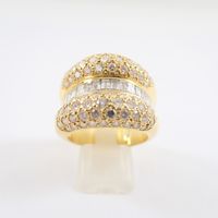 Importante bague : en or 750 mil. centrée d'un rang de diamants taille baguette entre 2 godrons pavés de diamants taille brillant (TDD : 63) (largeur : 19,5 mm environ) (tout petits éclats). 23,6 g. brut