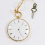 Montre de gousset : Boîtier rond en or 70 mil. Lunette et dos guilloché. Cuvette en or 750 mil. Cadran blanc à chiffres romains, chemin de fer pour les minutes. Mouvement mécanique à remontage manuel. (Diam. : 4,5 cm environ) (Avec clef de remontoir). 50,7 g. brut.