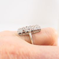 Bague : en platine 850 mil. à chaton plat rectangulaire pavé de diamants taille ancienne (les 2 principaux : 0,25 ct environ ; environ 1,60 ct au total) (TDD : 52,5 ; dimensions du chaton : 1,9 x 1 cm) (1 pierre dessertie, soudures). 5,1 g. brut.