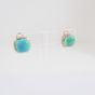 Paire de clips d'oreilles : 2 ors 585 mil. sertis chacun d'un cabochon de turquoise de forme coussin dans un entourage de petits diamants taille brillant (dimensions : 1,5 x 1,5 cm) (pierre manquante). 7 g. brut.
