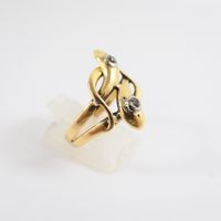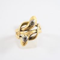 Bague "serpents" : 2 ors 750 mil. sertie de 2 diamants taille ancienne (TDD : 63) (largeur : 2 cm environ) (trace de mise à taille, très légère déformation). 5,8 g. brut