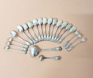 Cave à cigare en bois naturel à décor d'ogives et de colonnes torses, ouvrant par un rideau. L'intérieur à sept plateaux coulissants. (H: 36cm - P : 20,8cm) Rideau coulissant défectueux, taches d'humidité et accidents. On y joint un petit plateau en métal argenté gravé et guilloché, centré d'un cartouche gravé Pré Catelan. (Long : 20cm - Larg : 13,5cm).