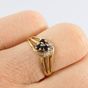Bague : à trois fils d'or jaune 750 mil. ornée de trois petits saphirs et de deux petits diamants taille brillant (0,01carats). (TDD : 53,5). Poids brut : 2g.