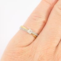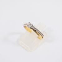Bague croisée : deux ors 750 mil ornée d'une ligne de diamants taille brillant (0,01 carats) et centrée d'un diamant taille brillant (0,10 carats environ) serti griffe. (TDD : 51). Poids brut : 2g