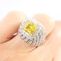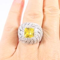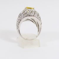 Bague dôme : en or gris 750 mil. centrée d'une pierre jaune d'imitation taille princesse dans un entourage rayonnant de petits diamants taille brillant (0,01 carats environ). (TDD : 54). Poids brut : 16g