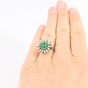 Bague fleur : en or gris 375 mil. centrée d'un cabochon d'émeraude dans un entourage de petits diamants taille brillant (0,02 carats environ). (TDD : 56). Poids brut : 6,3g. (Traces de mise à taille).