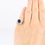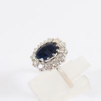 Bague Pompadour : en or gris 750 mil. ornée d'un saphir taille ovale (1,6 carats environ) dans un entourage de diamants taille brillant. (0,05 carats environ). (TDD : 51,5). Poids brut : 5,9g (fêles au niveau du saphir).