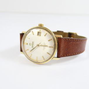 OMEGA : Montre sur bracelet. Boîtier rond en or jaune 750 mil, cadran à fond argent rayonnant (Diam. : 32mm). Index bâton appliqué à filet émaillé noir. Guichet dateur à 3h. Mouvement mécanique à remontage automatique. Bracelet en cuir embossé noir rapporté à boucle déployante papillon en métal doré. (Tour de poignet : 17cm). Poids brut : 45,9g.
