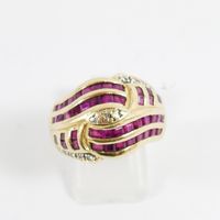 Bague bombée en or 750 mil rehaussée de lignes de rubis calibrés et de diamants (celui du centre accidenté) (Larg : 1,5 cm ; TDD : 53). 11,9 g brut.