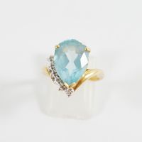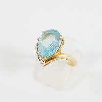Bague en or 750 mil ornée d'un topaze taille poire accidentée, soulignée de 6 diamants 8/8 (Dim topaze : 1,4 cm x 1 cm ; TDD : 52). 5,4 g brut.