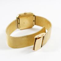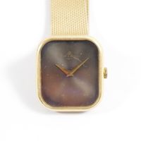 Montre de dame en or 750 mil sur bracelet tressé en métal doré, boîtier rectangulaire arrondi (Dim : 28 x 25 mm), cadran muet usé (rayure), BAUME et MERCIER, mouvement mécanique (remontoir non siglé). 55,6 g brut.