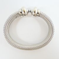 Bracelet semi-rigide : ouvert en or gris 750 mil. à décor de vannerie, 2 cabochons de saphirs noirs aux extrémités, tige probablement en métal à l'intérieur, signé Auritalie (longueur : 17,5 cm environ) (largeur : 10 mm environ) (éclats et manque de matière, léger enfoncement, rhodiage à prévoir). 32,3 g. brut [Exempté : art. 524 bis du CGI al. c]