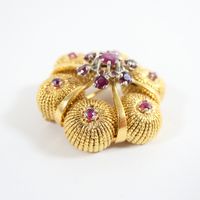 Broche fleur : 2 ors 750 mil. sertie de rubis ronds, les pétales formant chacun une demie sphère à décor de fils d'or torsadés, travail français (diamètre : 3,8 cm environ) (éclats). 28,2 g. brut