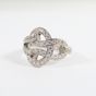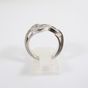 CARTIER "Agrafe" : Bague en or gris 750 mil. stylisant une agrafe de couture sertie de diamants taille brillant, signée et numérotée (TDD : 53) (largeur : 16,6 mm environ) (manque un diamant). 9,9 g. brut