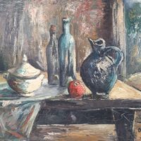 Anders OSTERLIND (1887-1960) "Nature morte à la soupière et aux bouteilles", circa 1942-43 Huile sur toile. Signée en bas à droite. Dimensions : 65 x 81 cm. (Craquelures) (Encadrée) Cette oeuvre est répertoriée au Catalogue raisonné d'Anders Osterlind sous le n°656.