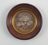 Deux miniatures rondes sur papier peintes à la gouache représentant une Nature morte aux poires et raisins, et un Paysage méditerranéen. Traces de signatures. Diamètres (à vue) : 5,5 et 7,5 cm. (Encadrées) On y joint une gravure en couleurs "Ninon de Lenclos". Dimensions : 8 x 7 cm. (Encadrée)