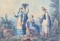 Ecole du début du XIXème siècle "Conversation dans un paysage italien méridional et ruines" Aquarelle, crayon et rehauts de gouache, traces du signature sur la colonne brisée. Dimensions (à vue) : 21 x 26 cm. (Rousseurs, insolé, traces d'humidité) (Encadrée)