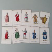 EYRIÈS (Jean-Baptiste) La Russie, ou costumes, moeurs et usages des Russes. Suite de 24 gravures coloriées avec leur livret explicatif. Paris, Gide fils, sd (vers 1823). Petit in-32 (13,5 x 8,5 cm), sous emboîtage. Les cartes représentent différents costumes d'hommes et de femmes de contrées de l'empire de Russie : Finlande, Tartarie, Estonie, populations de l'Oural, de Sibérie, de la Volga, du Kamtchatka, et de Mongolie. (Rousseurs, une carte avec un profil de chien crayonné au dos)