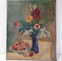 ROIMBIS (Ecole française du XXème siècle) "Nature morte aux fleurs et pêches" Huile sur toile. Signée en bas à droite, contresignée au dos. Dimensions : 65 x 54 cm. (Manques de matières, piqûres) (Non encadrée)