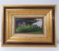 Serguei TOUTOUNOV (1958) "Vase au bouquet de bleuets" et "Bord de rivière aux iris" Deux huiles sur panneaux d'isorel. Signées en bas à droite. Dimensions : 27 x 19 cm et 11 x 19 cm. (Encadrées)