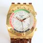 Alfaro K&F Genève. Montre de forme tonneau. Boîtier en or jaune 750 millièmes signé. Cadran blanc à index et aiguilles luminescents, guichet date à 4h. Mouvement quartz. Diamètre : 40 mm environ. Bracelet en cuir (*) signé et boucle déployante en or jaune 750 millièmes signée, taille : 19 cm environ. Poids brut : 174,98 g. Sans écrin ni papiers.