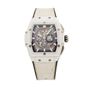 HUBLOT, Spirit of Big Bang. Montre de forme tonneau. Référence 601.HX.0173. LR. Boîtier en céramique signé et numéroté 1185455. Cadran squelette à index appliqués, trois sous-compteurs, guichet date à 4h, aiguilles luminescentes. Mouvement mécanique à remontage automatique. Calibre HUB4700. Dimensions : 48 x 54 mm environ. Bracelet en cuir avec boucle déployante signée. Copie de facture du 08/08/2019, sans boîte.